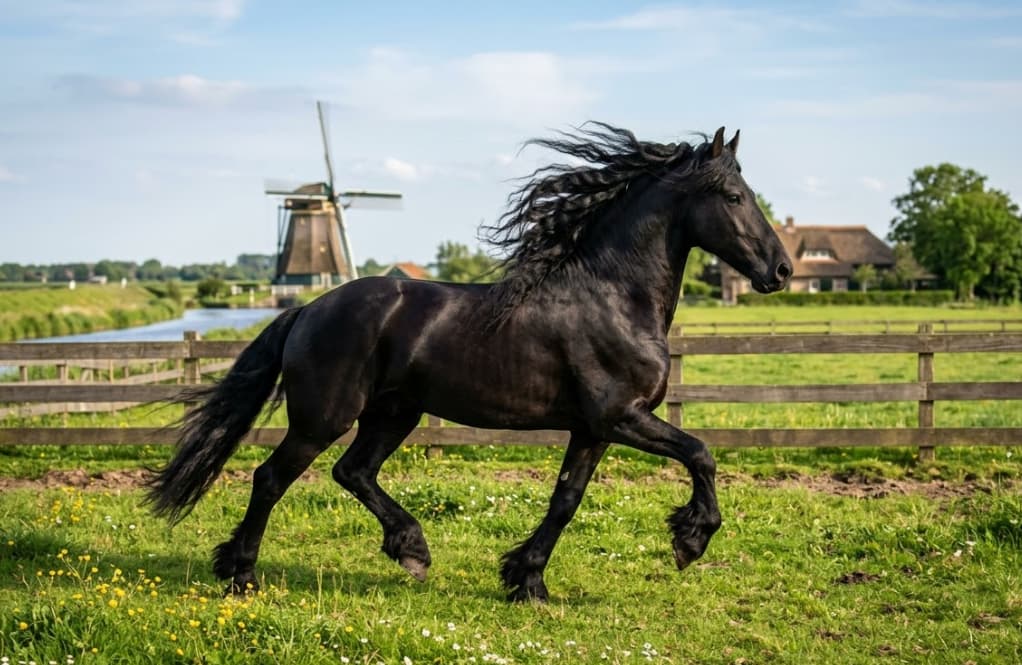 Der Friese stammt aus der niederländischen Provinz Friesland. Diese prachtvollen Rappen bestechen durch ihr tiefschwarzes Fell und ihre wallende Mähne. Ursprünglich als kräftige Arbeitspferde gezüchtet, glänzen sie heute vor allem im Dressursport, bei Shows und vor der Kutsche. Ihr Charakter ist ebenso beeindruckend wie ihr Äußeres: Friesen gelten als sanftmütig, lernwillig und sehr menschenbezogen. Mit ihrem stolzen Gang und der hohen Knieaktion ziehen sie weltweit alle Blicke auf sich.