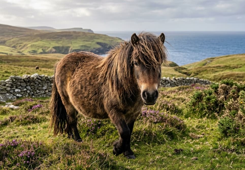 Das Shetland Pony stammt von den rauen Shetlandinseln nördlich von Schottland. Trotz seiner geringen Größe von maximal 107 Zentimetern ist es im Verhältnis zu seinem Körpergewicht eines der stärksten Pferde der Welt. Früher schufteten sie als Grubenponys in Kohleminen, heute sind sie beliebte Begleiter für Kinder und talentierte Fahrpferde. Mit ihrem dichten Winterfell und dem charmanten Dickkopf sind sie extrem robust. Ihr intelligentes, manchmal etwas eigensinniges Wesen macht sie zu unverwechselbaren Persönlichkeiten.